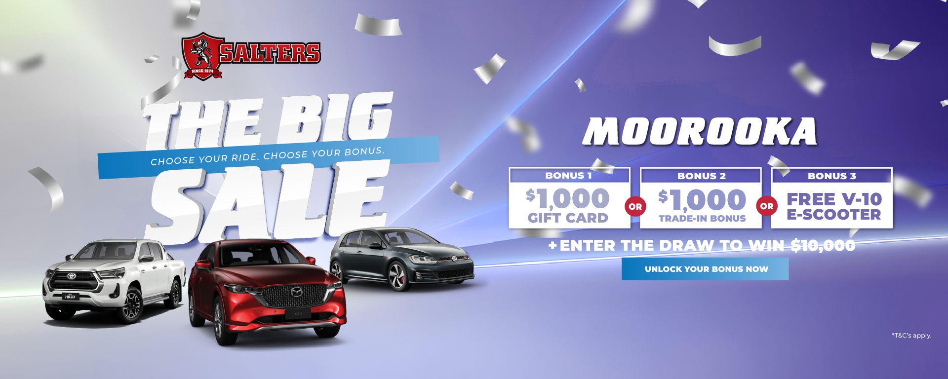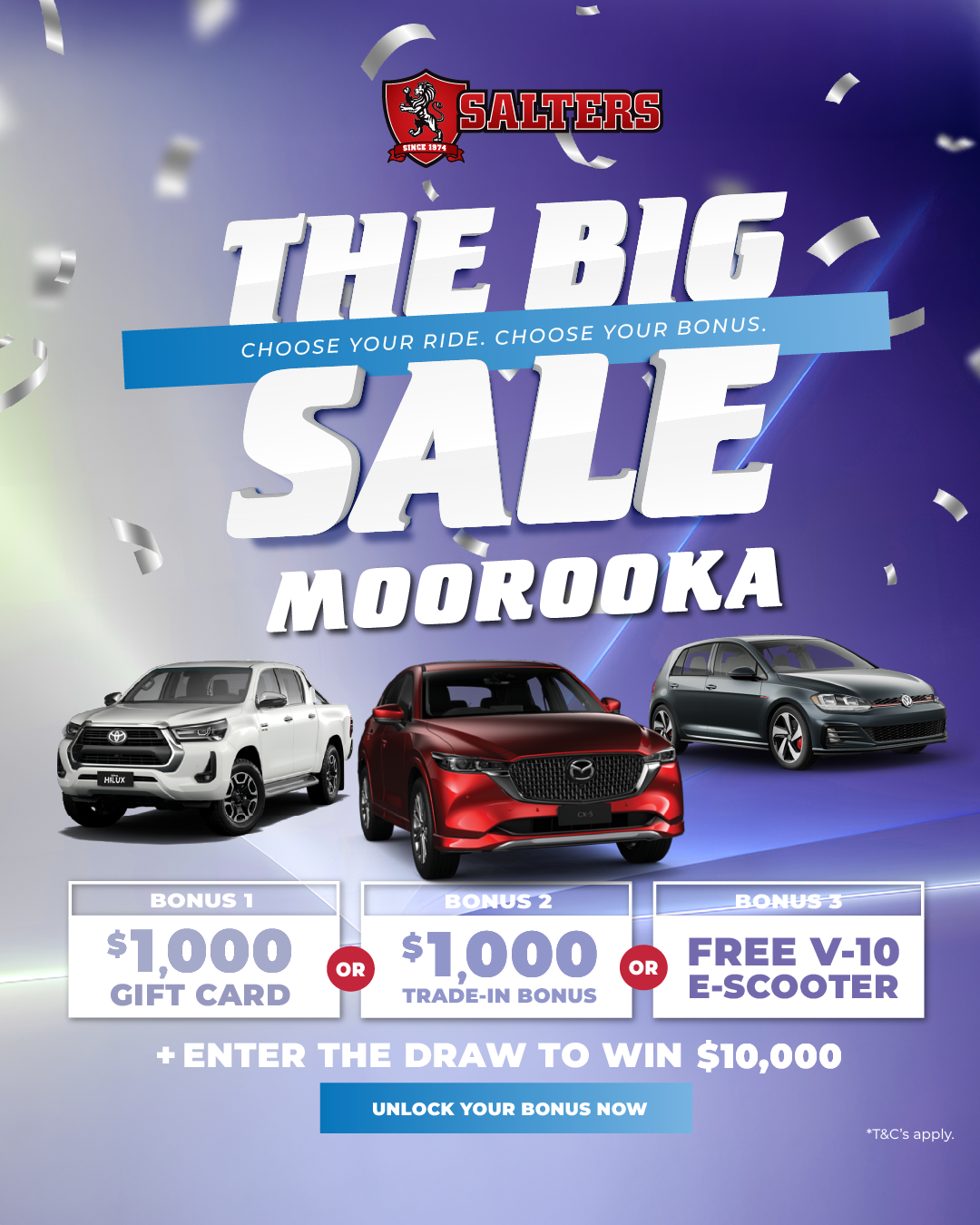 *Terms and Conditions apply: Bonus offer valid on select stock only. Bonus offer is a choice of either ‘$1000 Trade-In Bonus’, ‘$1000 Gift Card’ or ‘FREE V-10 E-Scooter’. ‘$1000 Trade-In Bonus’ will only be paid on qualified trade-in vehicles, that are still in good working order, are currently registered, and can be driven to dealership location at time of vehicle changeover. ‘$1000 Gift Card’ will be presented in the form of a Prezzee Smart eGift Card. ‘FREE Benzina V-10 E-Scooter’ is valued at $1,099 RRP delivered by Westpoint EV. Choice of Bonus Offer is applicable on in-stock vehicles only, purchased from Wednesday 4/06/2025 – Saturday 7/06/2025 unless extended or varied. $10,000 Prize will be presented in the form of a Gift Voucher. One (1) entry per vehicle purchased during Sale Event dates and paid in full by 30/06/2025. $10,000 Prize will be drawn Monday 21/07/2025. Winner will be notified by contact details supplied on vehicle contract, and if not claimed within 24 hours of draw, prize is forfeited, and prize will be redrawn. Excludes Fleet and Government buyers. Offer cannot be redeemed for cash, returned for a refund or transferred. Bonus offer will be provided during or after vehicle delivery, no later than 31/07/2025. Bonus Offer will be issued to the individual stated on the vehicle contract if nominated. Westpoint Autos and Salters Cars reserves the right to amend these Terms and Conditions at any time.